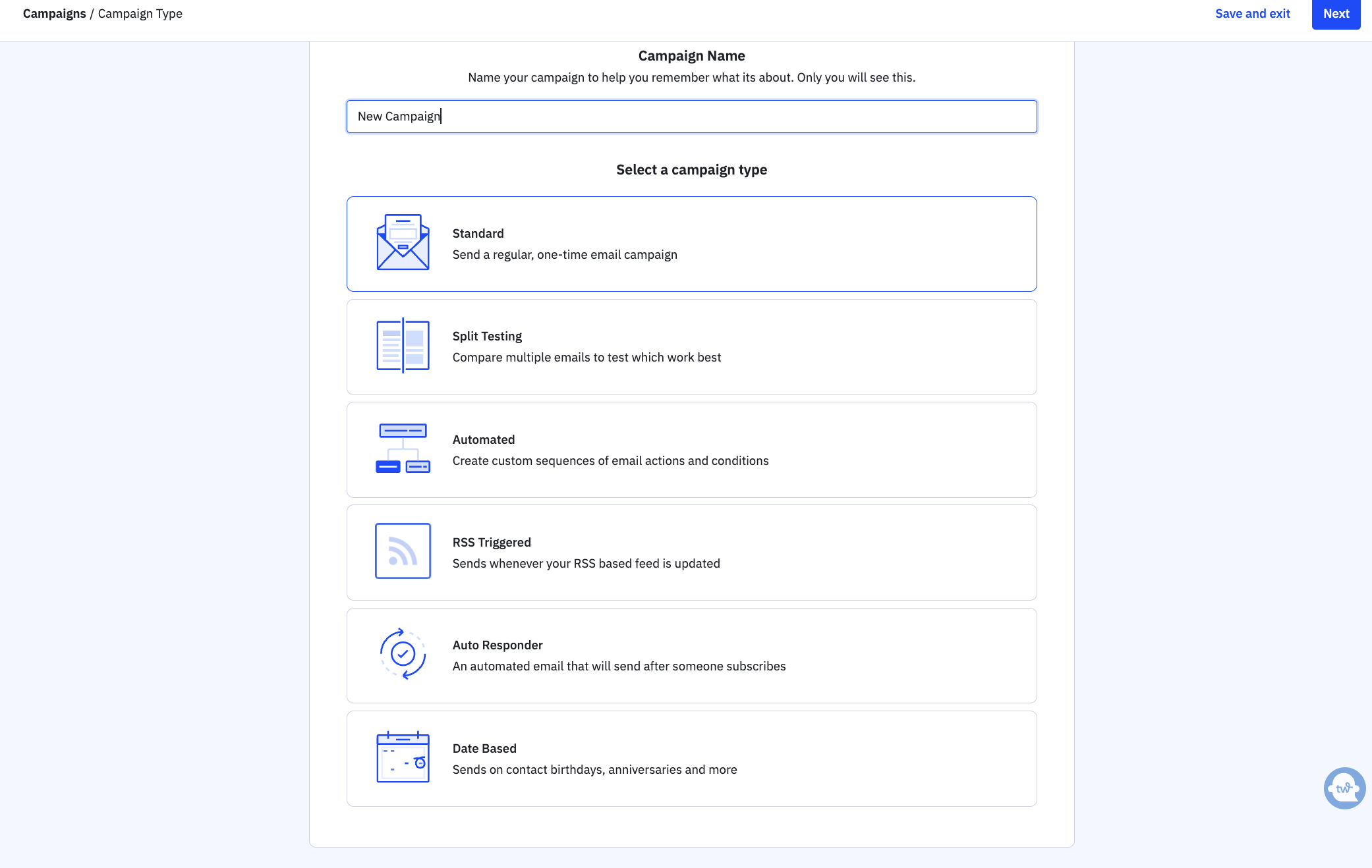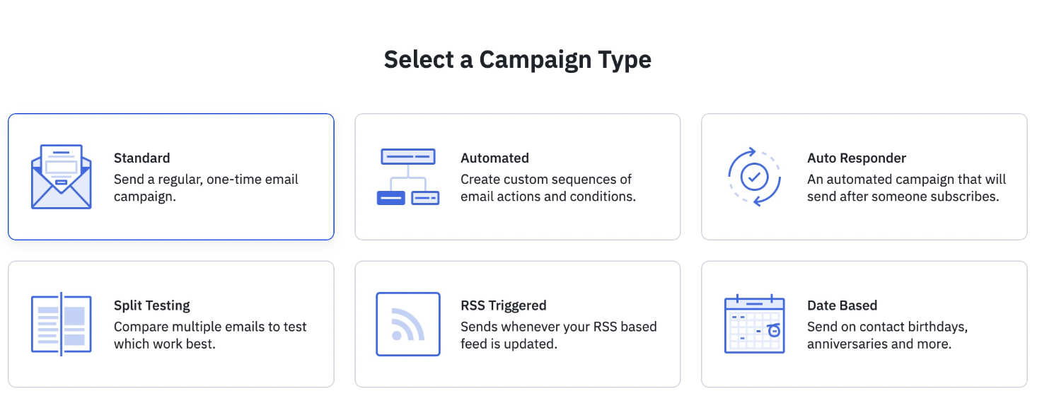 Select the type of campaign you want to send (e.g., Standard, Automated, Auto Responder, Split Testing, RSS Triggered, Data-Based Campaign).