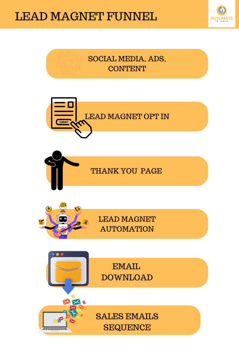 The funnel starts with traffic sources like social media, blog posts, or ads, which direct people to a lead magnet signup form.
