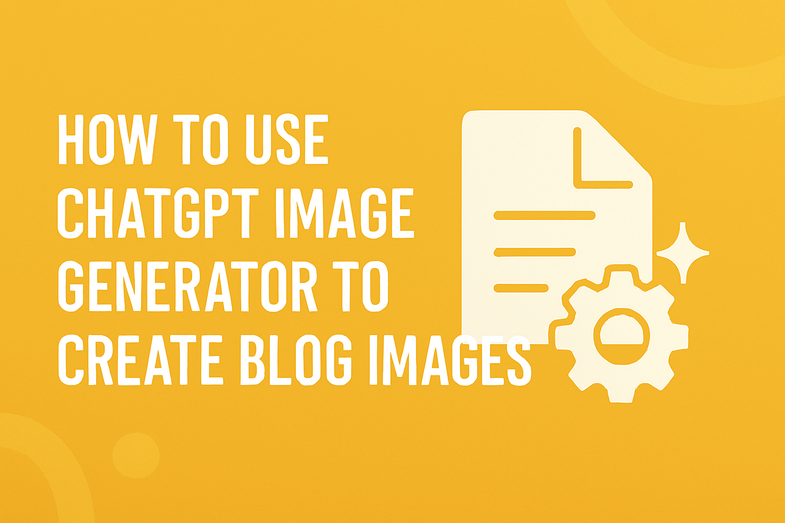 “Take a clean blog banner with a soft or flat background and overlay the blog title in bold white text: ‘How to Use ChatGPT Image Generator To Create Blog Images’. Use large, modern font (all caps or title case), centred layout. Incorporate abstract icons or pattern elements representing automation, writing, and tools (e.g., document, gear, spark). Stick to brand colours like #ffbd59 for background or accents. This works well for banner-style visuals you reuse with updated titles.”