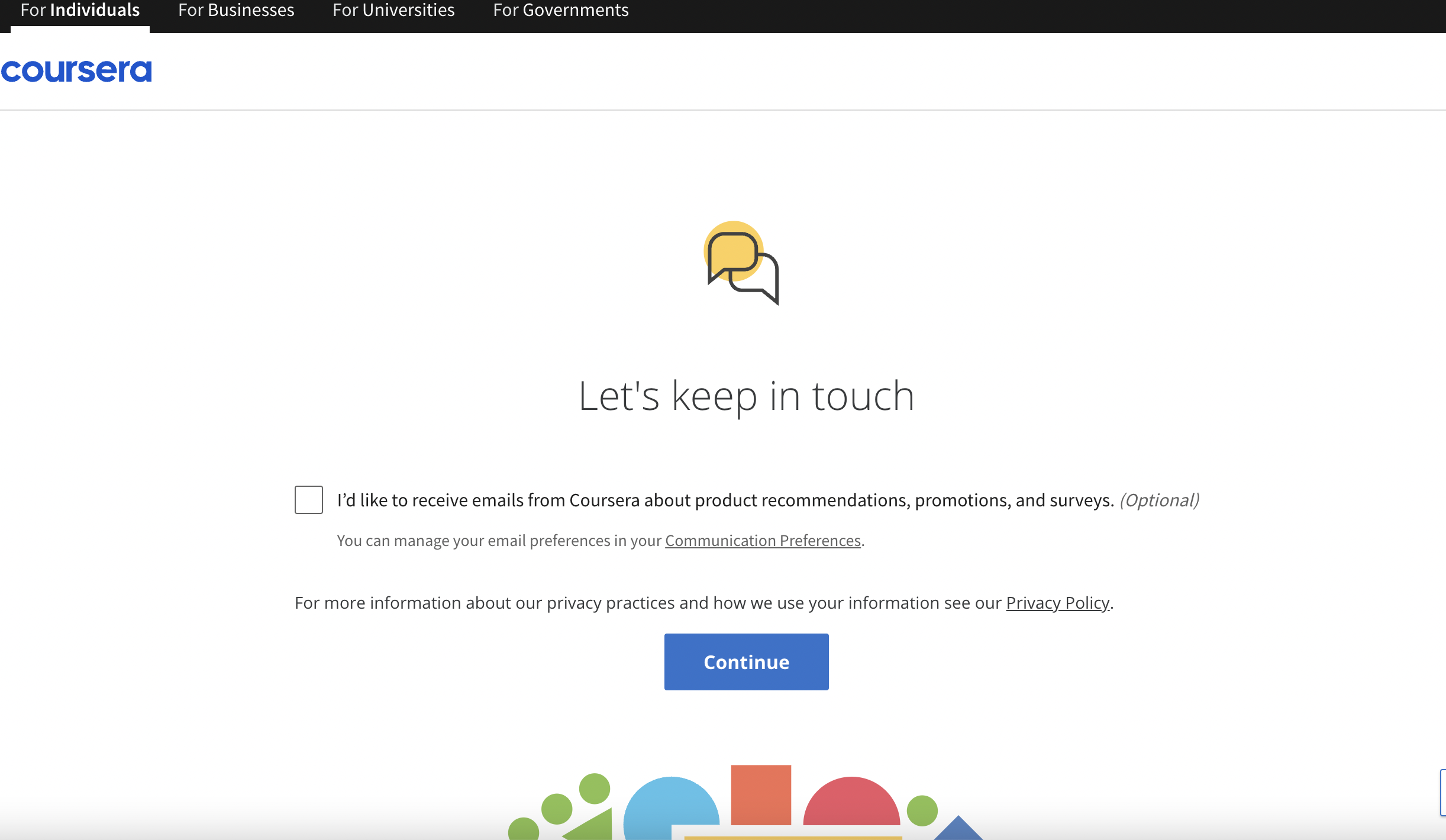 After signing up for Coursera, the process is seamless and provides an option to subscribe to product recommendations. A "Let's Keep in Touch" message encourages further interaction with the company, while a prominent blue "Continue" call-to-action emphasizes staying connected